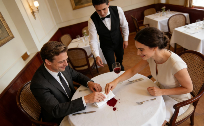 Es passiert den Besten: Der Wein ergießt sich über das weiße Tischtuch, ein Stück Spinat verfängt sich unbeobachtet zwischen den …