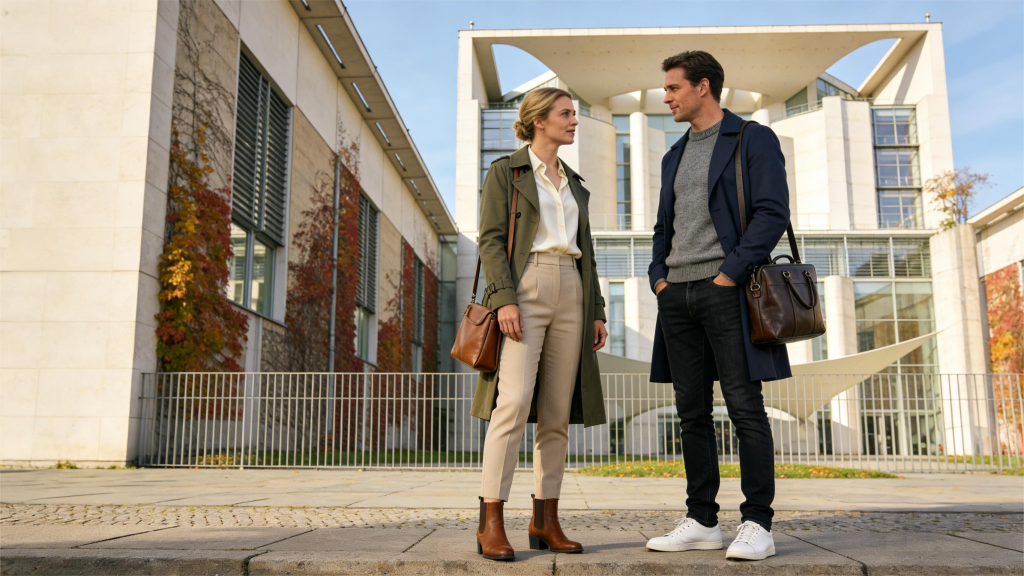 • München & Süddeutschland: Traditionell gepflegter und konservativer. Qualitativ hochwertige Basics, klassische Schnitte, dezente Farben. Ein gut sitzender Blazer oder eine Lederhose (bei traditionellen Anlässen) sind hier akzeptierter als in Berlin.